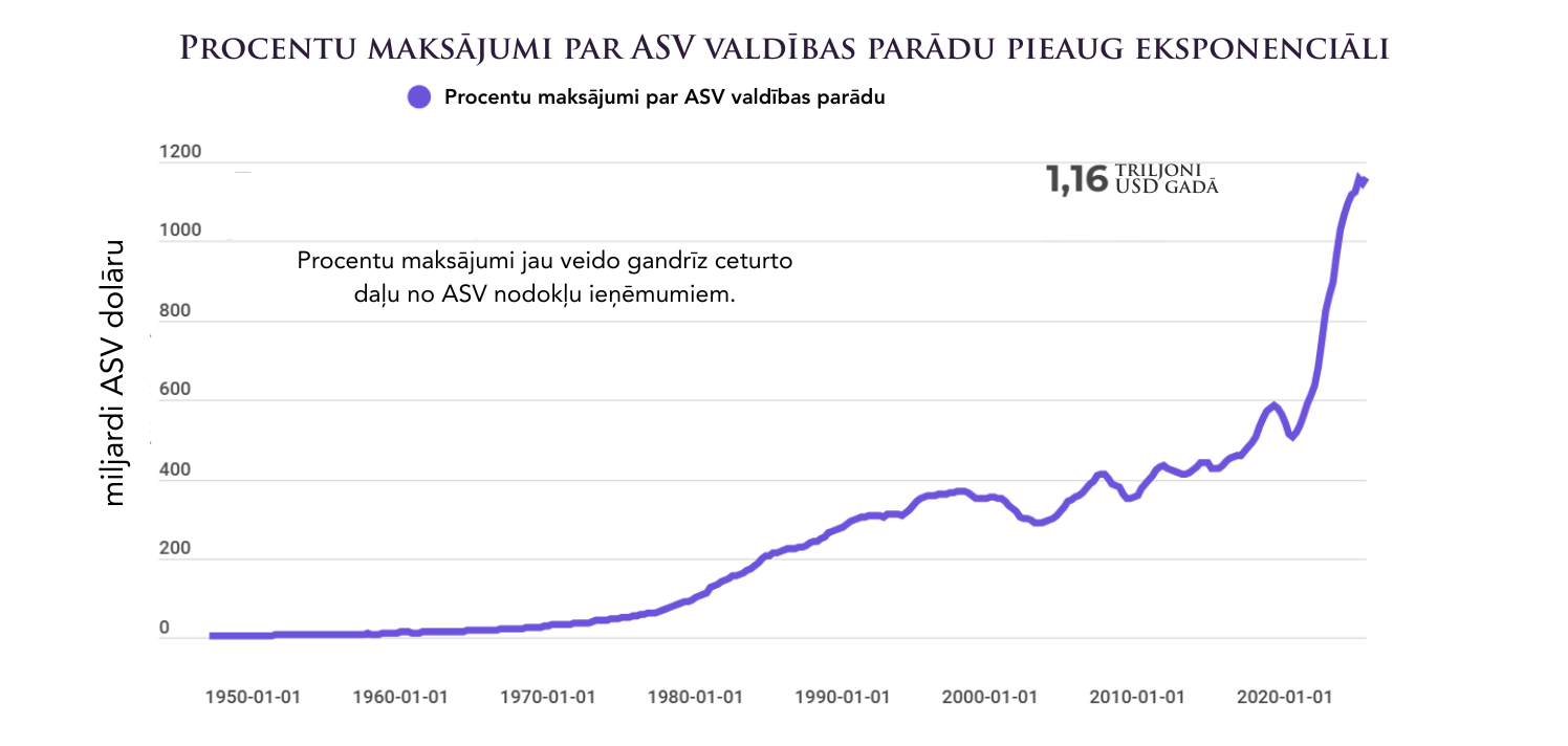 Tagad, kad procentu likmes ir pieaugušas, ir radusies jauna problēma: strauji pieauguši procentu maksājumi par valdības parādu. Tas viss notiek laikā, kad notiek ļoti dārga pāreja uz zaļo enerģiju, pieaug aizsardzības izdevumi un pieaug slodze uz sociālo sistēmu. Visas šīs problēmas kaut kā ir jārisina. Jāņem vērā arī tas, ka, ja inflācija atkal paātrināsies, centrālās bankas vairs nevarēs atļauties agresīvu procentu likmju paaugstināšanu, jo tas novestu pie nopietnas parādu krīzes.
