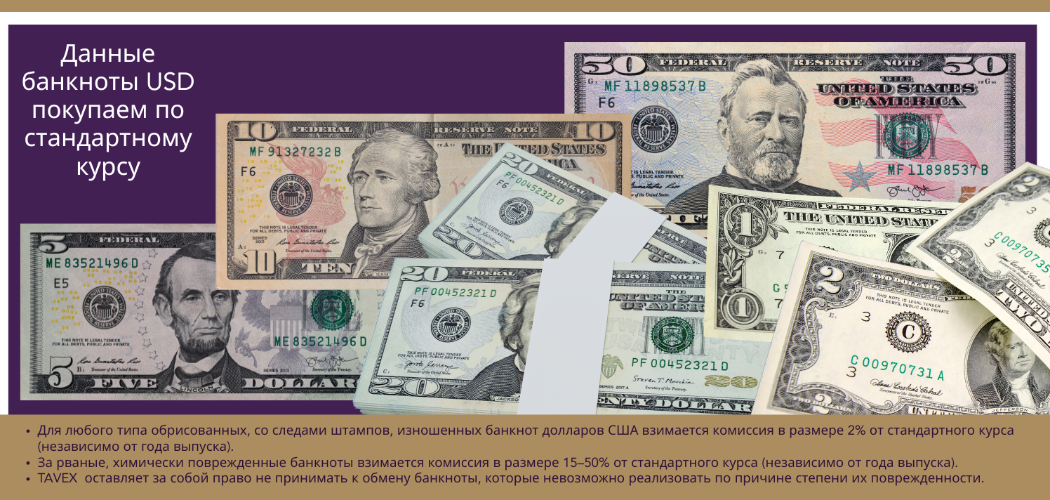 Комиссия также распространяется на банкноты меньшего номинала. На черно-белые банкноты, за исключением банкнот номиналом 1 и 2 доллара (которые выпускаются только черно-белыми), применяется курс скупки на 2% ниже. На изображении выше показаны банкноты, которые покупаем по стандартному курсу.
